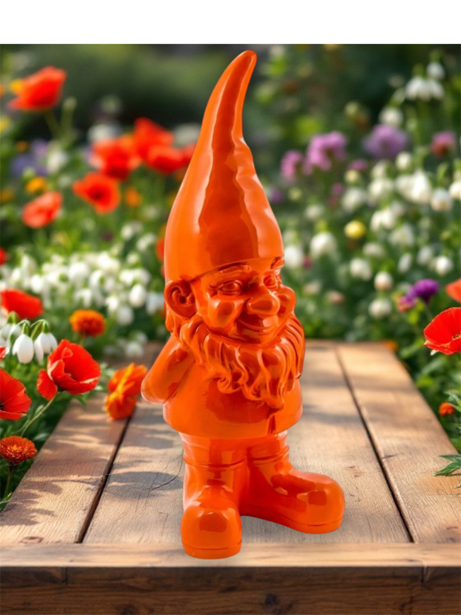 Enhance your decor with the Giant Orange Standing Gnome Figure. Its lively colour and happy expression make it a fantastic addition to any setting, spreading joy and a sense of fun wherever it’s placed.